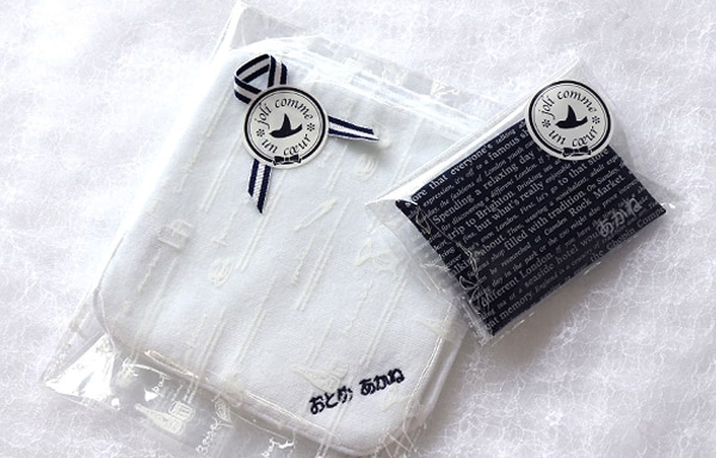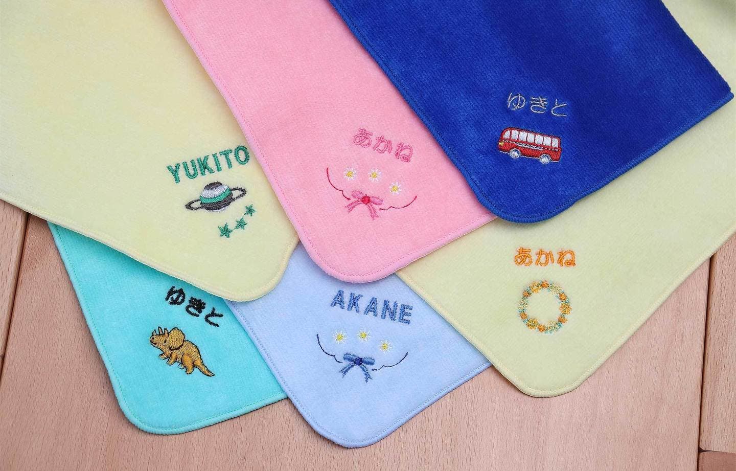 お子様のお名前刺繍をお入れした今治製のタオルハンカチやおくるみ、スタイなど。病院や企業のロゴ入りスリッパ、ロゴ入りエプロンなど。